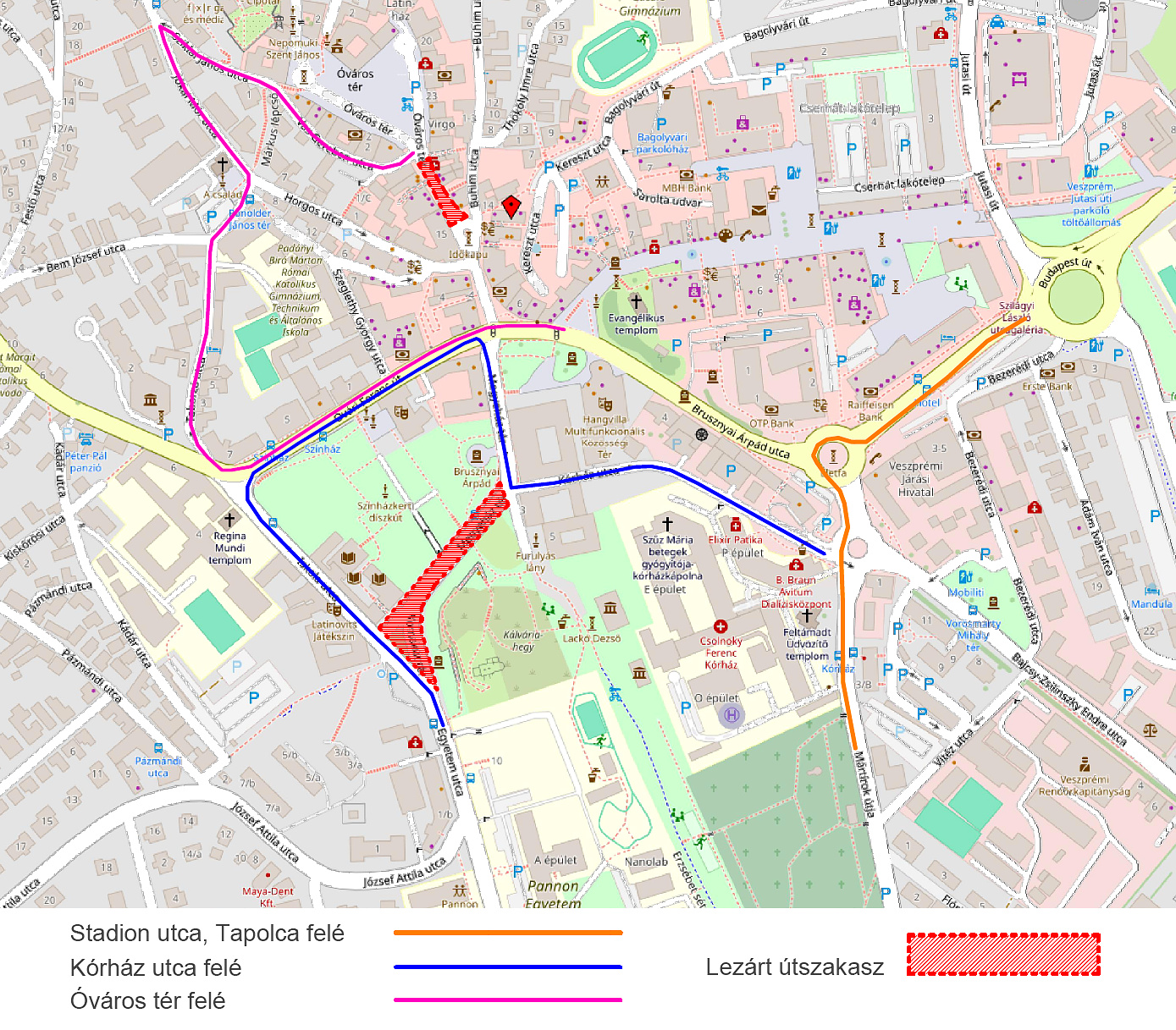 Az egyik helyszín az SZTK parkoló és a Megyeház tér lezárása a Kórház utca – Komakút tér közötti útszakaszon. A lezárás miatt a Stadion utca – Tapolca útirány terelő útvonalon közelíthető meg.